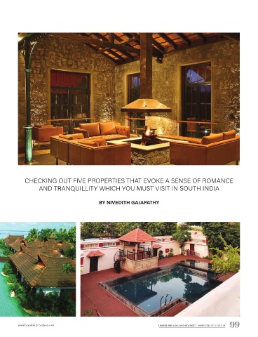 CHECKING OUT FIVE PROPERTIES THAT EVOKE A SENSE OF ROMANCE AND TRANQUILLITY WHICH YOU MUST VISIT IN SOUTH INDIA BY NIVEDITH GAJAPATHY 99 www.hospitality-horizon.com DECEMBER 2024-JANUARY 2025 hospitality horizon